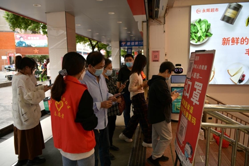 “請戴好口罩,配合測量體溫,打開閩政通掃一掃張貼碼” “沒有智能手機的叔叔阿姨,請到一旁登記一下身份信息” …… 在商場超市、農貿市場等經營場所 他們化身“服務員” 為市民群眾提供細致服務