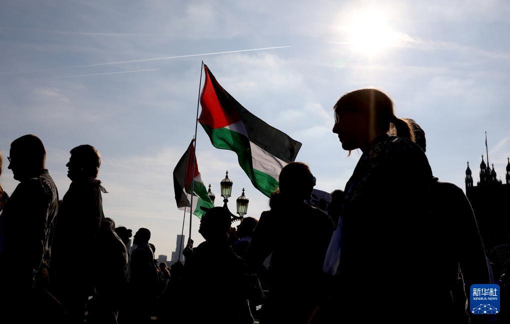 10月11日,在英國倫敦,游行隊(duì)伍經(jīng)過大本鐘。 當(dāng)日,英國民眾在倫敦舉行游行活動(dòng)聲援巴勒斯坦,呼吁加沙實(shí)現(xiàn)持久和平。 新華社記者 李穎 攝